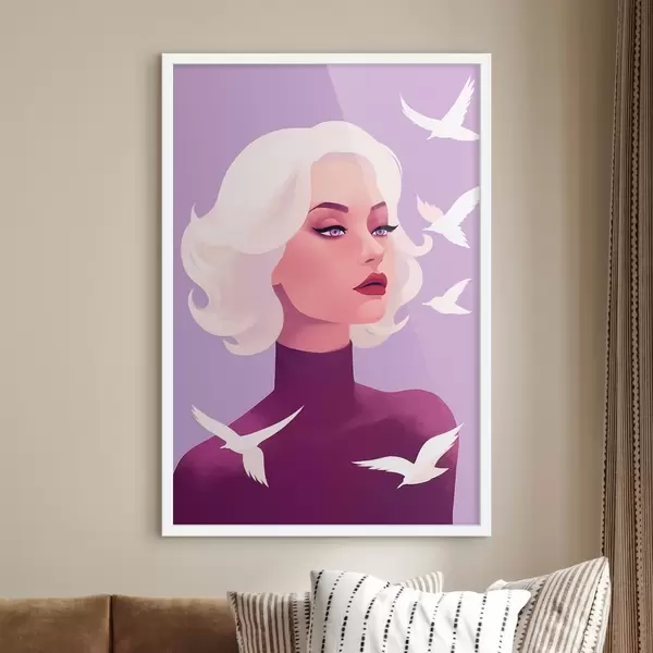 Poster Naise portree valgete juustega lindudega taustal Nr f44681