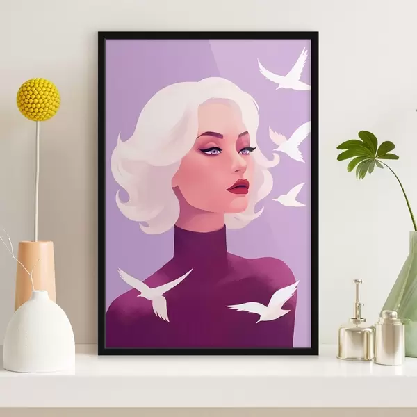 Plakat Naise portree valgete juustega lindudega taustal f44681