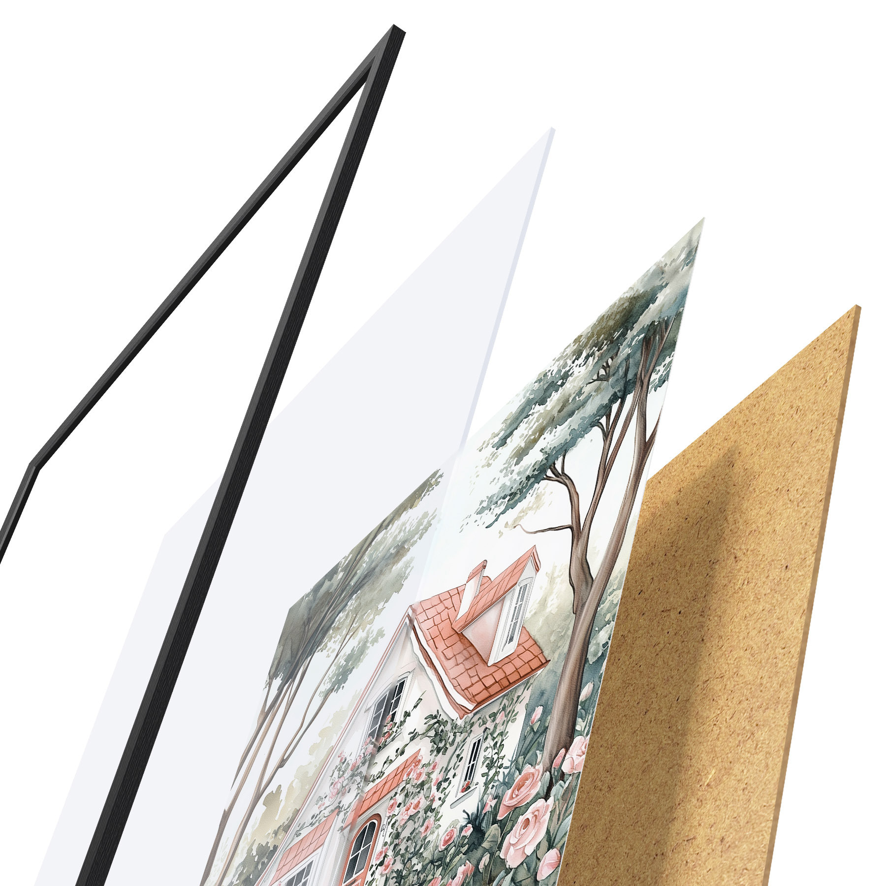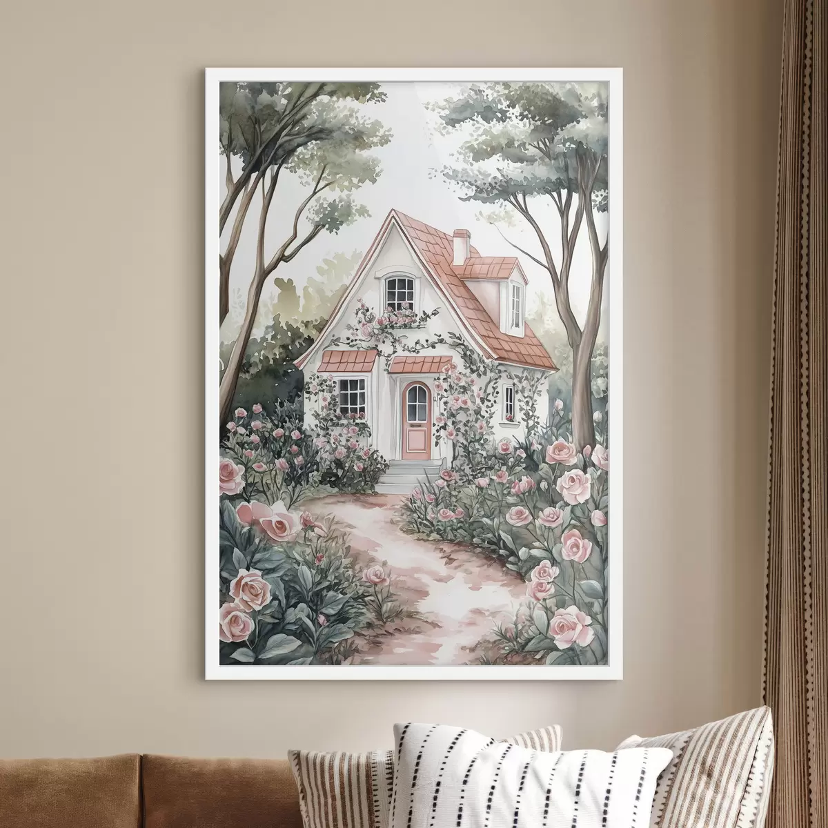 Plakat Valge maja koos rooside aiaga metsas f44716