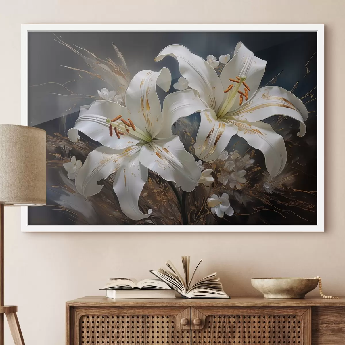 Plakat Lillelilled tumedal taustal koos dekoratiivsete elementidega f44848