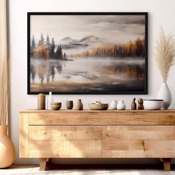 Poster Udune tekstuurne järvemaastik mändide ja mägedega, pilvine hall taevas Nr f44856