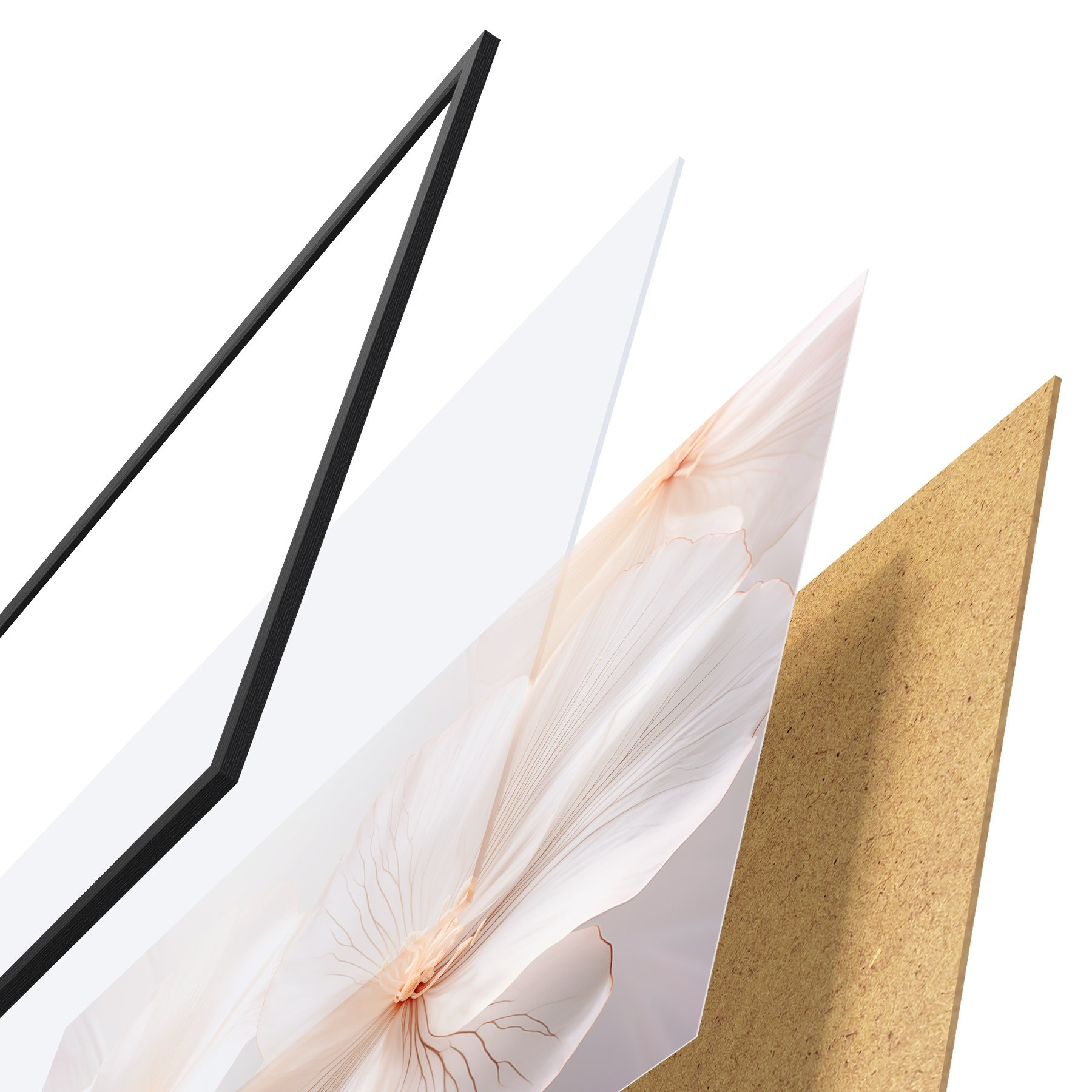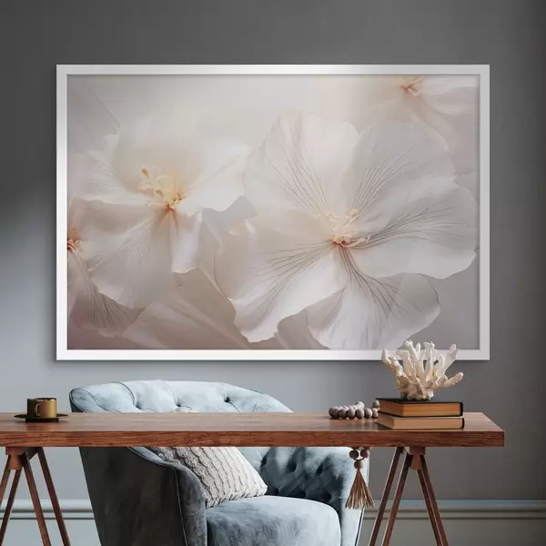 Plakat Õrnad valged õied kroonlehtedega ja pehmete pastelsete värvidega keskosadega, mis loovad unenäolise ja eeterliku lillekunsti f44858