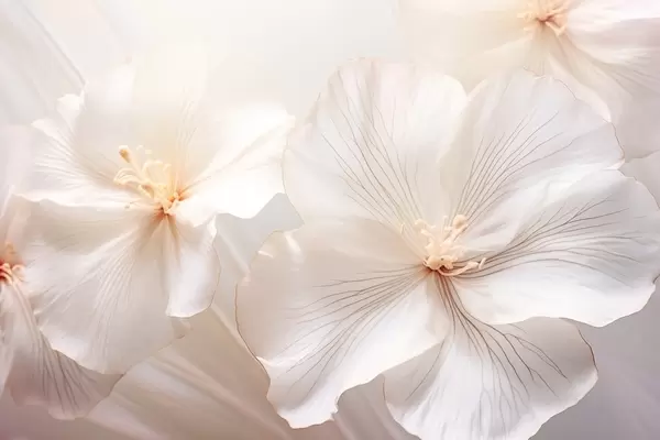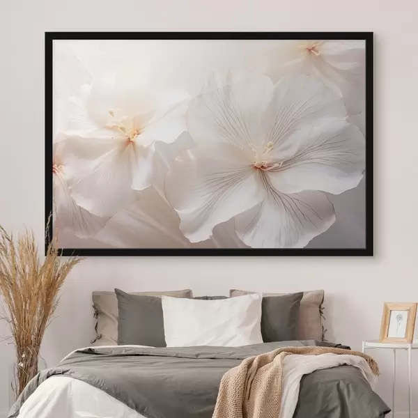 Poster Õrnad valged õied kroonlehtedega ja pehmete pastelsete värvidega keskosadega, mis loovad unenäolise ja eeterliku lillekunsti Nr f44858