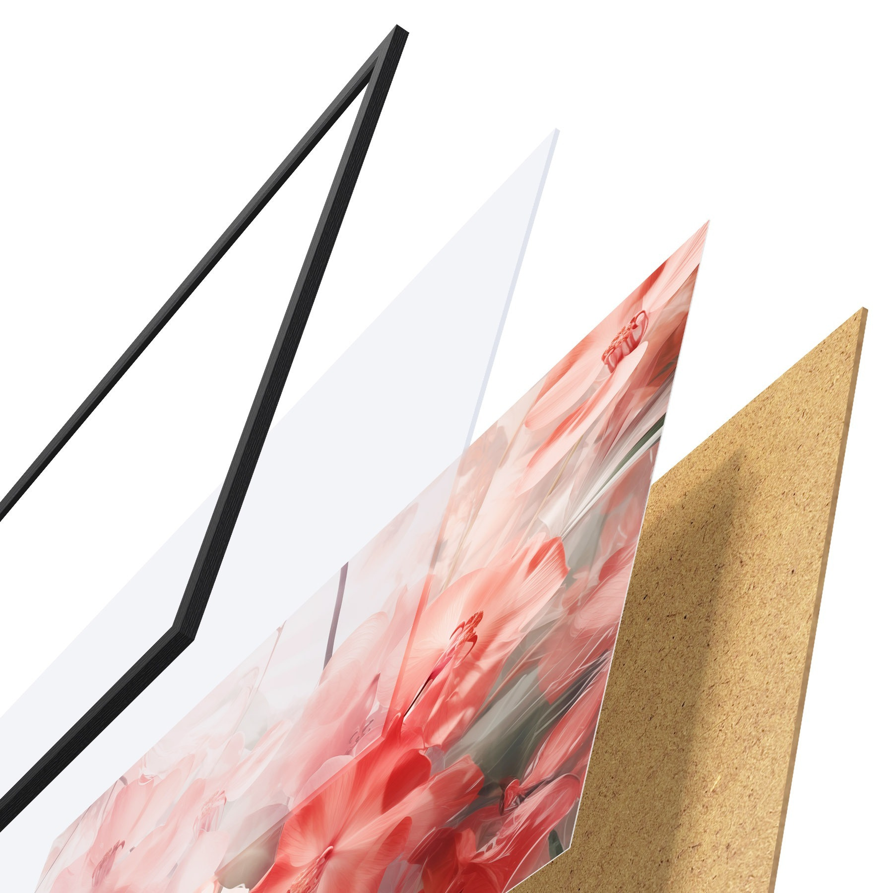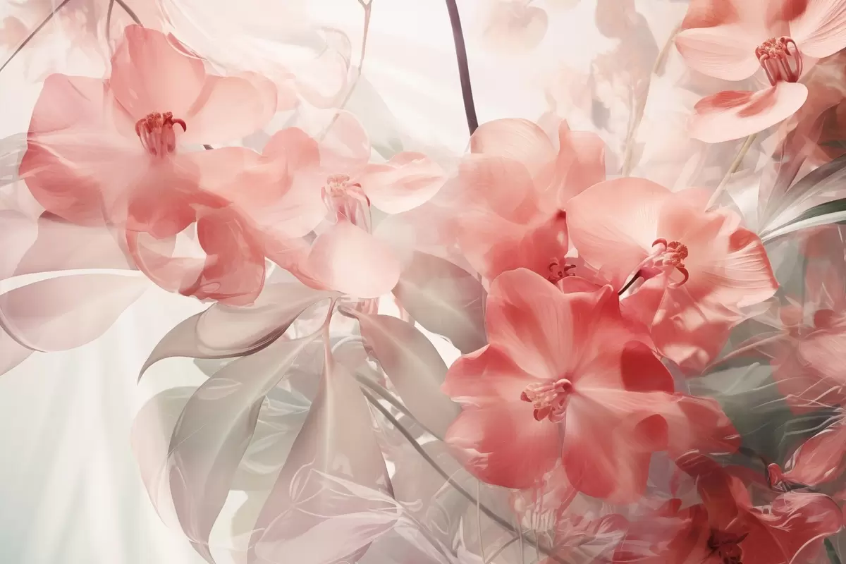 Poster Eredad roosad troopilised lilled koos pehmete, vaoshoitud roheliste lehtedega, mis loovad unenäolise õrna tekstuuri Nr f44861