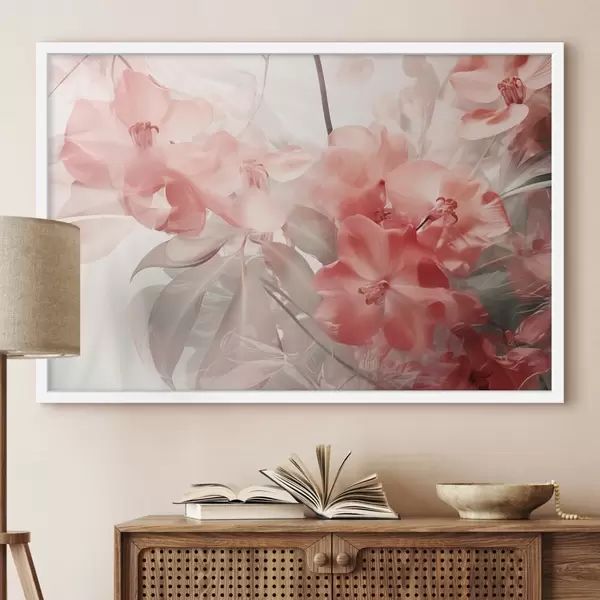 Plakat Eredad roosad troopilised lilled koos pehmete, vaoshoitud roheliste lehtedega, mis loovad unenäolise õrna tekstuuri f44861