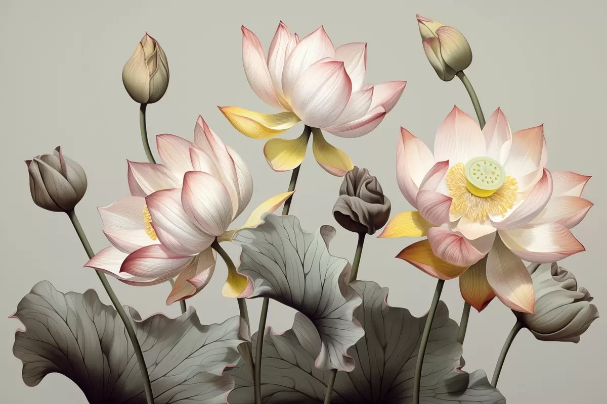 Poster Pastelsete kroonlehtede ja roheliste lehtedega lootoslilled, vaoshoitud värvipaletis, tavalisel taustal Nr f44862