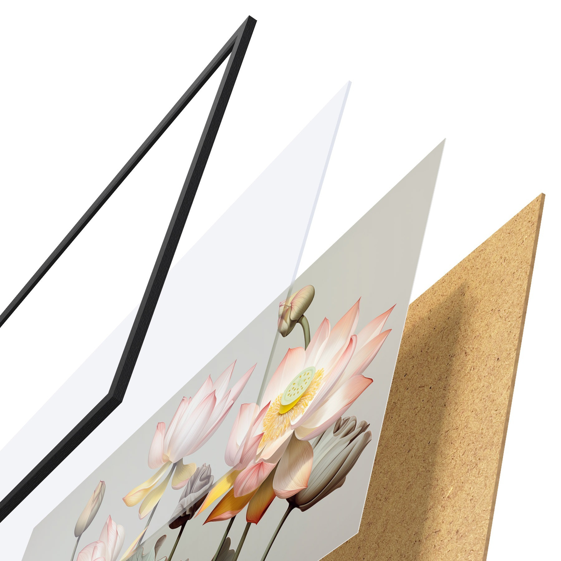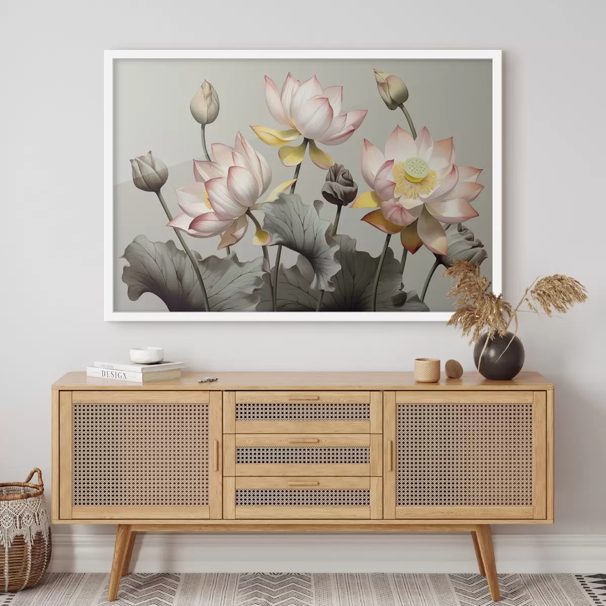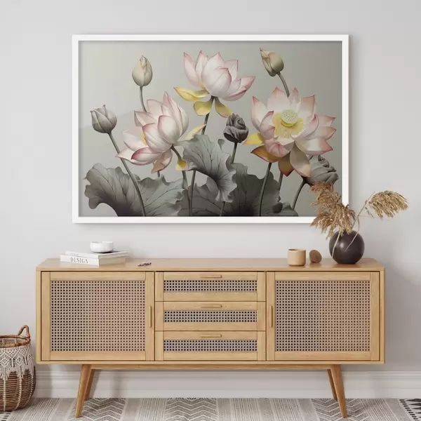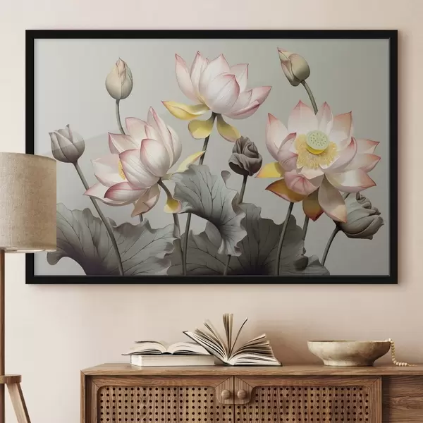 Plakat Pastelsete kroonlehtede ja roheliste lehtedega lootoslilled, vaoshoitud värvipaletis, tavalisel taustal f44862
