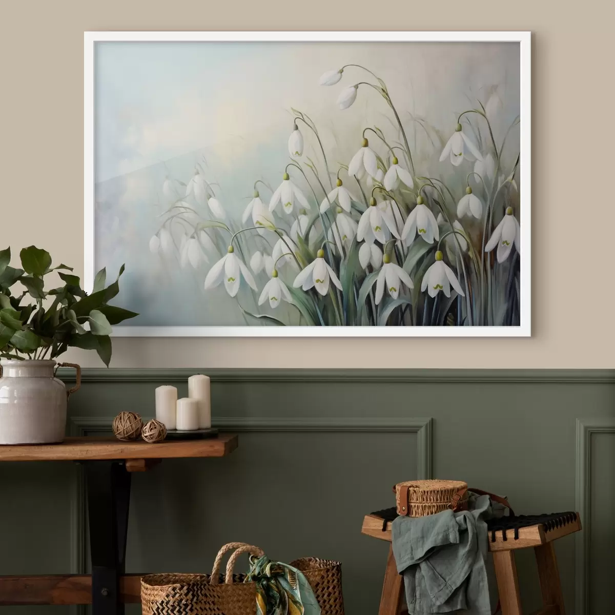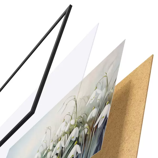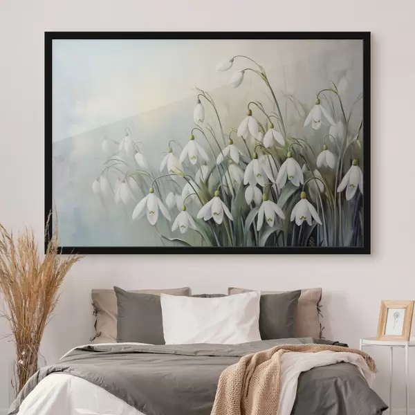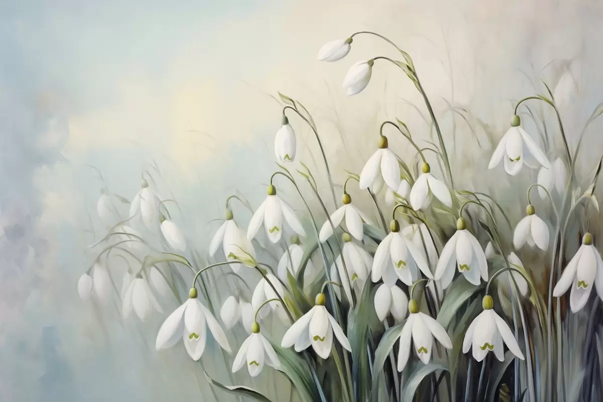 Poster Valged lumikellukesed siniste ja roheliste varte ja lehtedega, pehmed pintslitõmbed, hägune taust Nr f44864