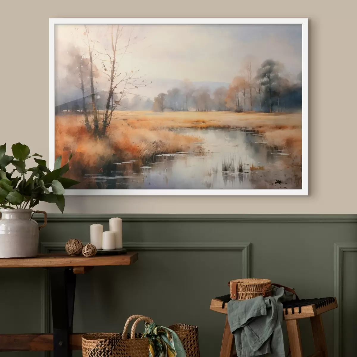 Poster Rahulik tekstuuriga maastikumaali imitatsioon pilliroost ja paljaste puude, rahuliku vee all taevas Nr f44867