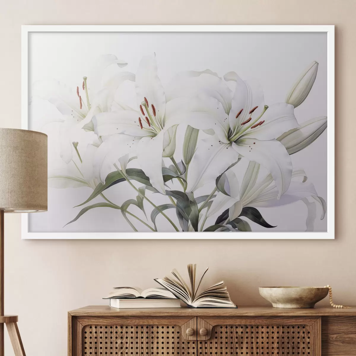Poster Roheliste lehtedega, õrnade kroonlehtedega ja pehme valge taustaga valge lillede kimp Nr f44868