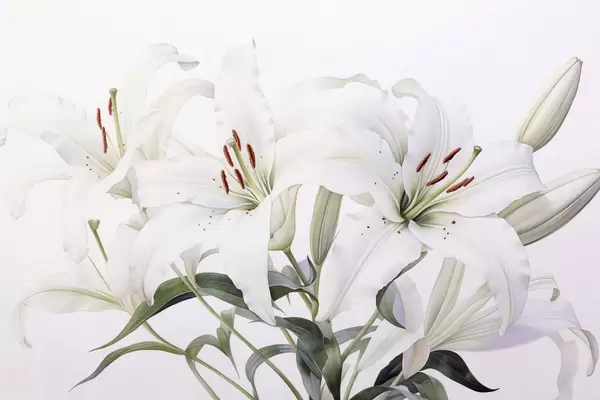Poster Roheliste lehtedega, õrnade kroonlehtedega ja pehme valge taustaga valge lillede kimp Nr f44868