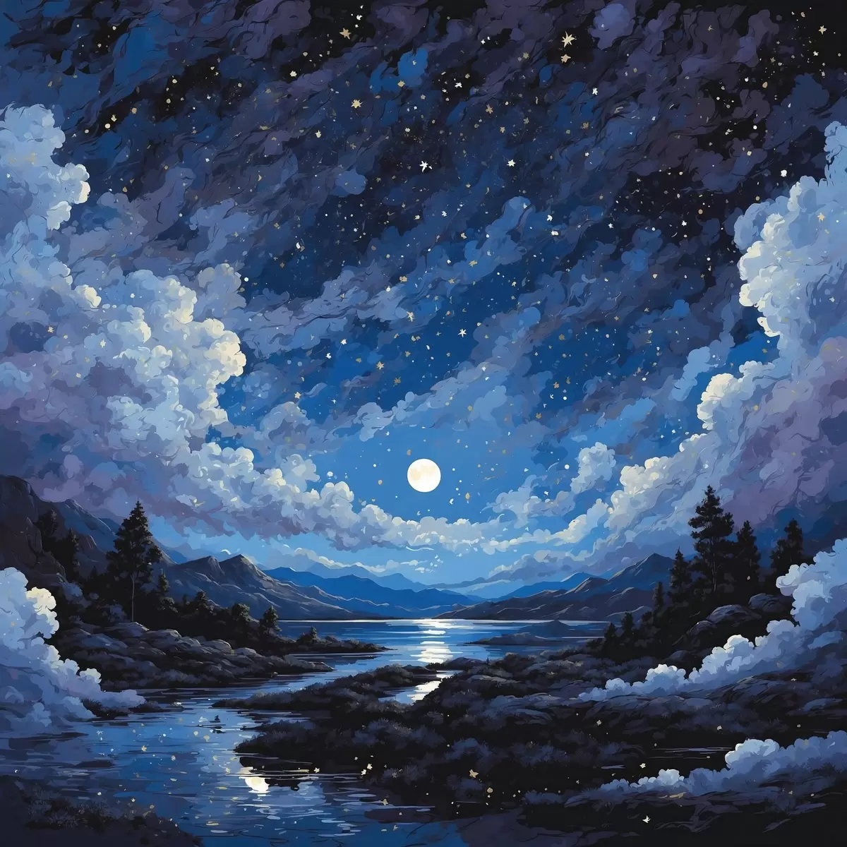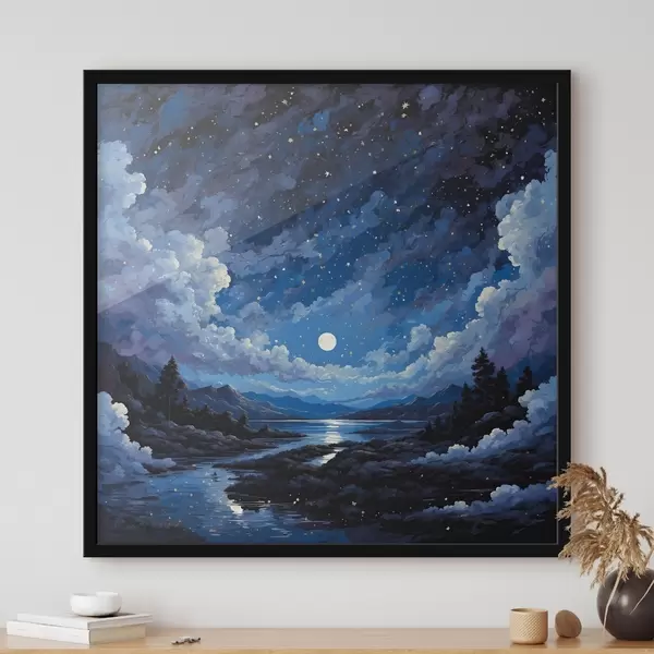 Poster Öötaevas kuu ja tähtedega mägimaastiku kohal Nr f44872