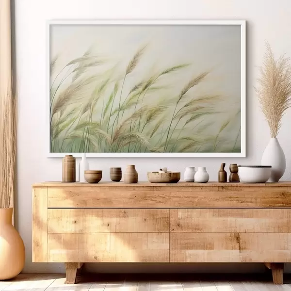 Plakat Nisupõld kollaste ja roheliste viljateradega, pehmed pintslitõmbed ja kerge värvipalett, loomulik atmosfäär f44923