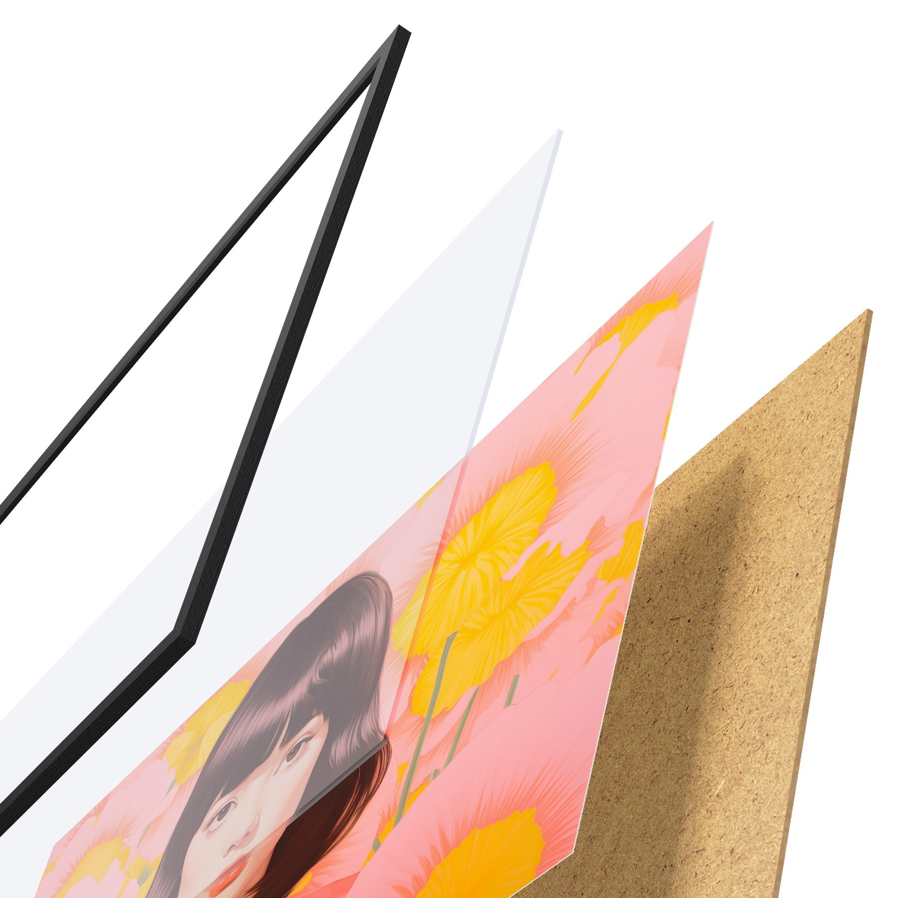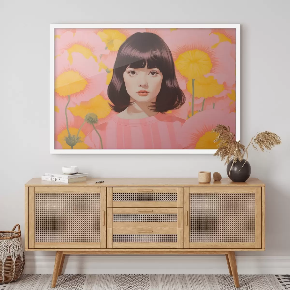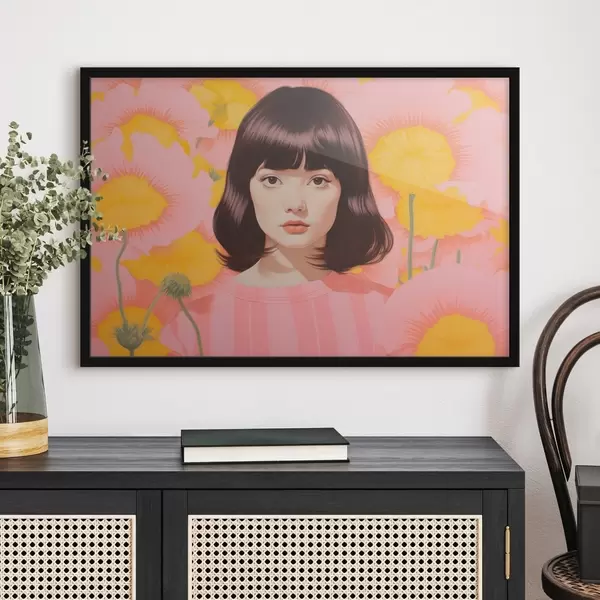 Plakat Dekoratiivne minimalistlik portree aasia tüdrukust kollaste ja roosade lillede väljal f44924