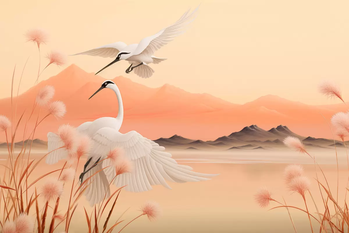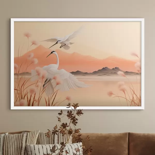 Plakat Valged kraanad koos roosa pillirooga esiplaanil, taustal mäed ja järv, pehme oranž valgus f44925
