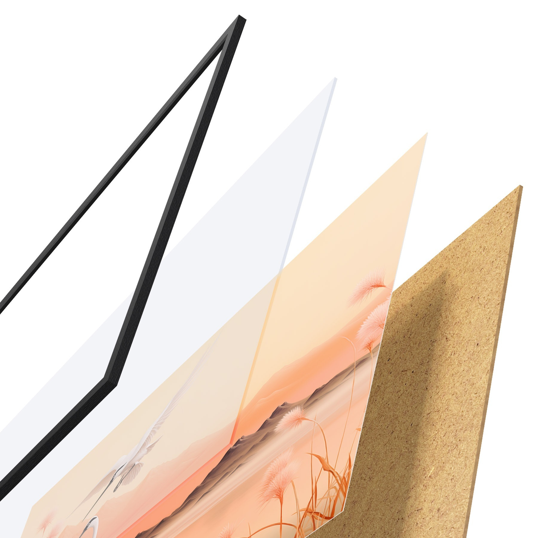 Poster Valged kraanad koos roosa pillirooga esiplaanil, taustal mäed ja järv, pehme oranž valgus Nr f44925