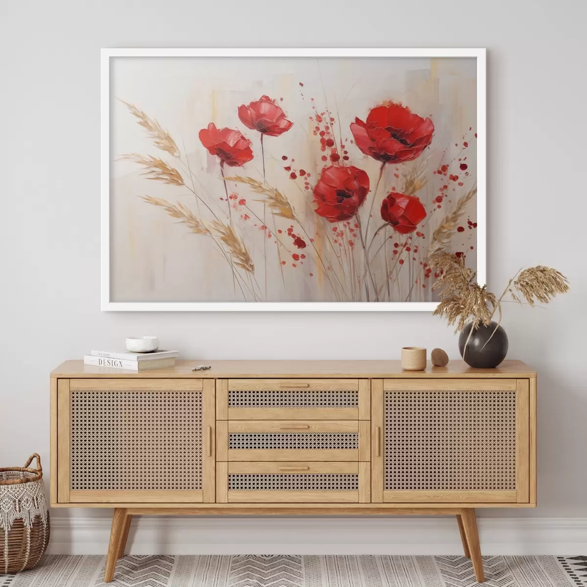 Plakat Punased moonililled koos kollaste nisuvartega, pehmel, neutraalsel taustal, millel on punased värviplekid f44926