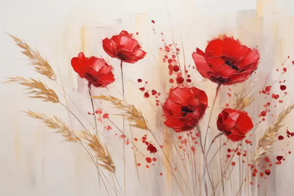 Plakat Punased moonililled koos kollaste nisuvartega, pehmel, neutraalsel taustal, millel on punased värviplekid f44926