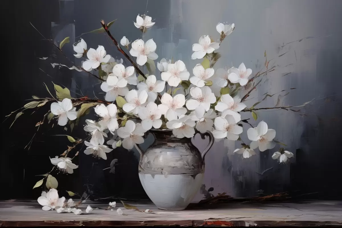 Poster Õitsvad oksad vaasis tumedal taustal maalilises stiilis Nr f44949