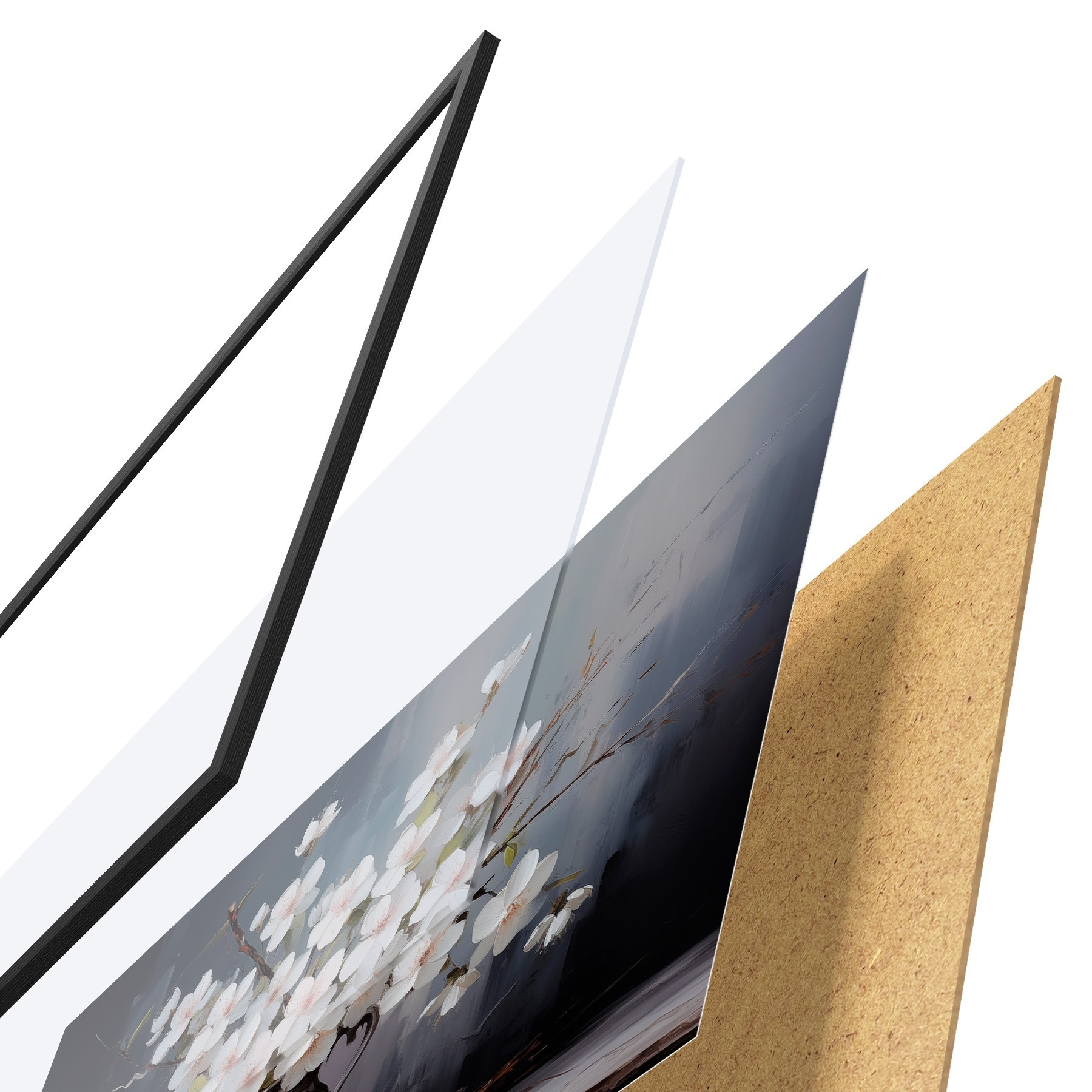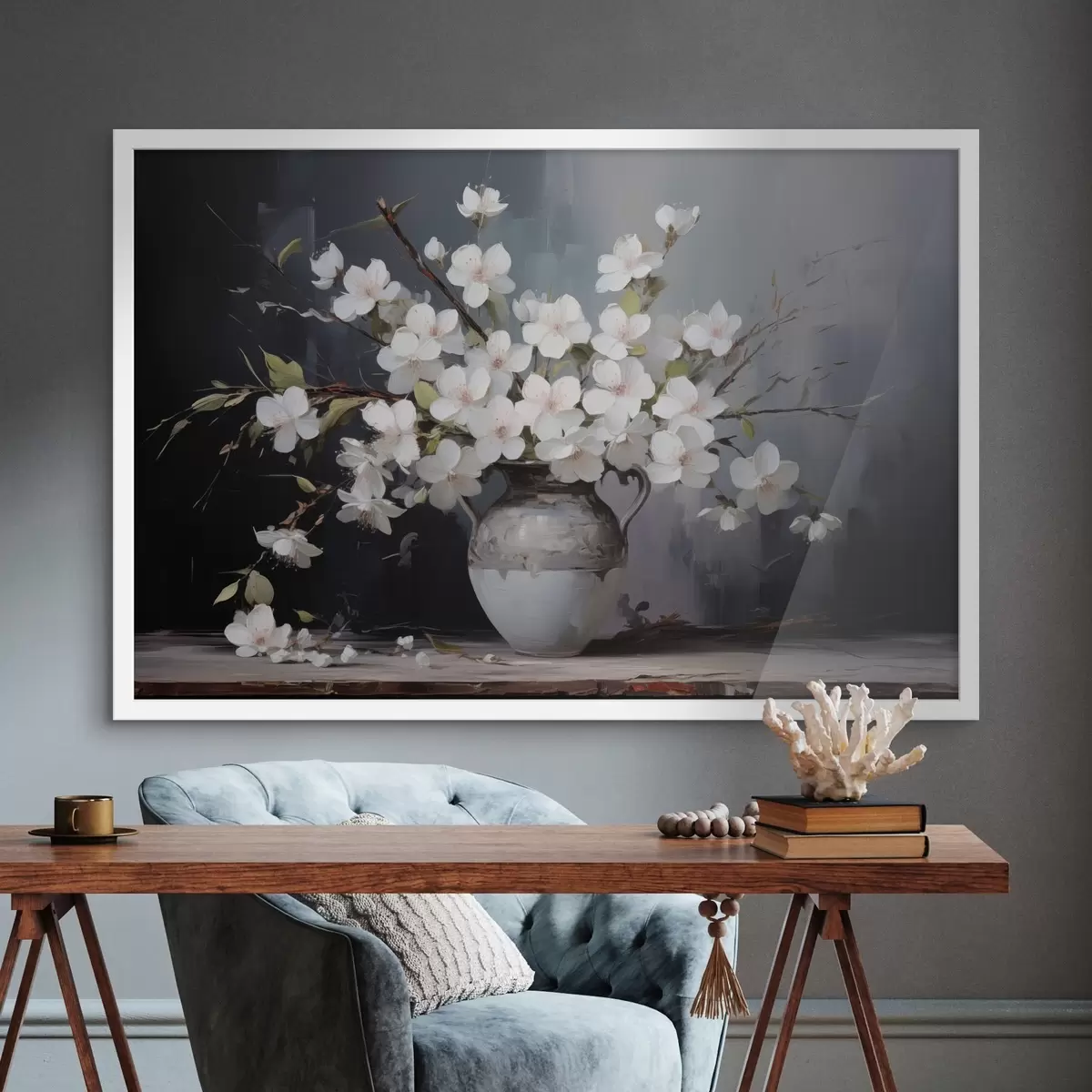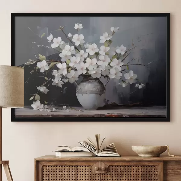 Plakat Õitsvad oksad vaasis tumedal taustal maalilises stiilis f44949