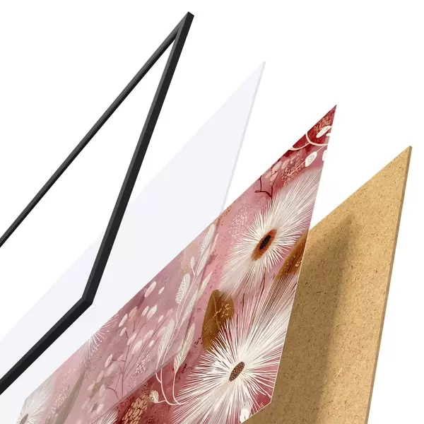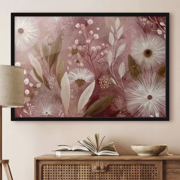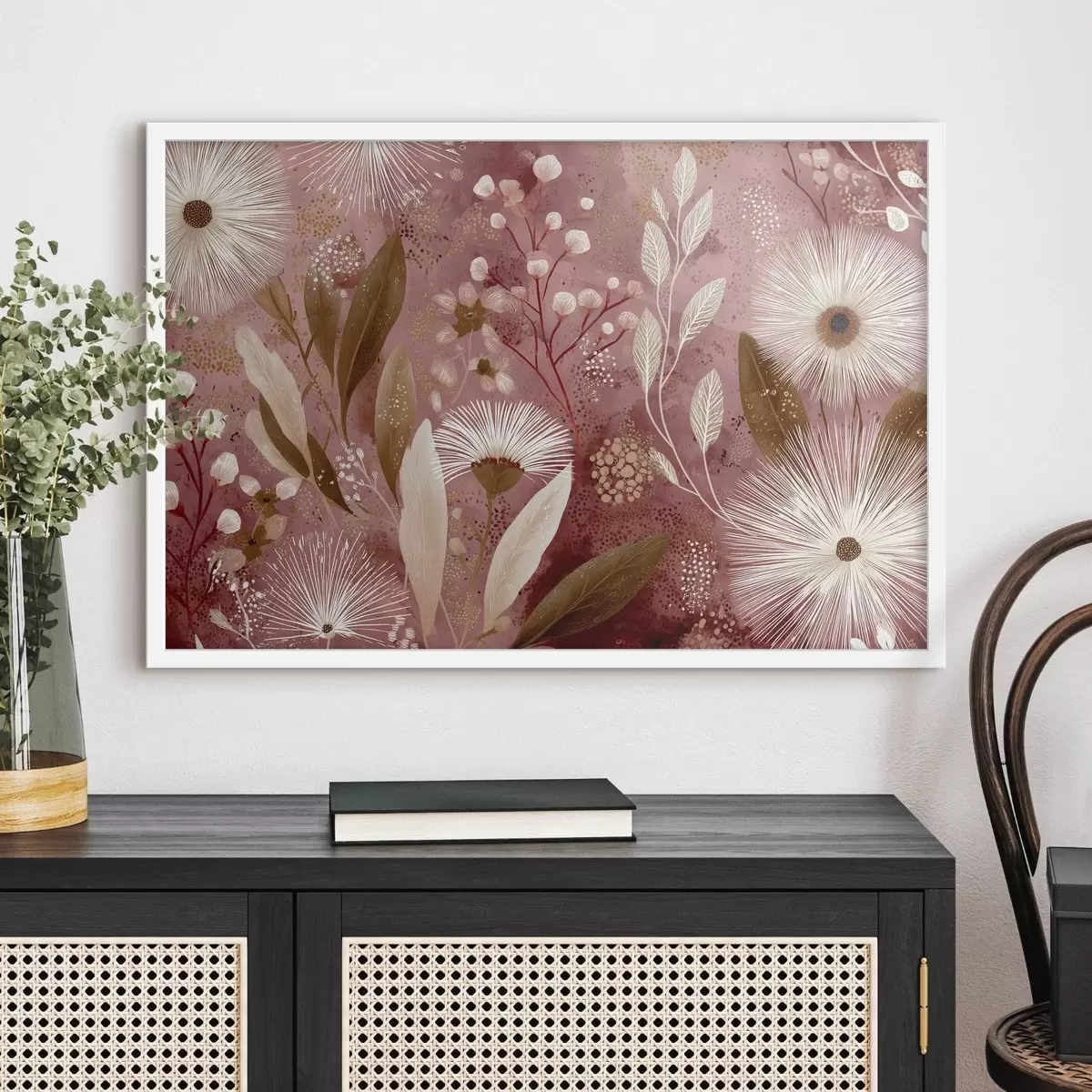 Poster Boho stiilis valged lilled punasel taustal, detailne joonistus Nr f44979