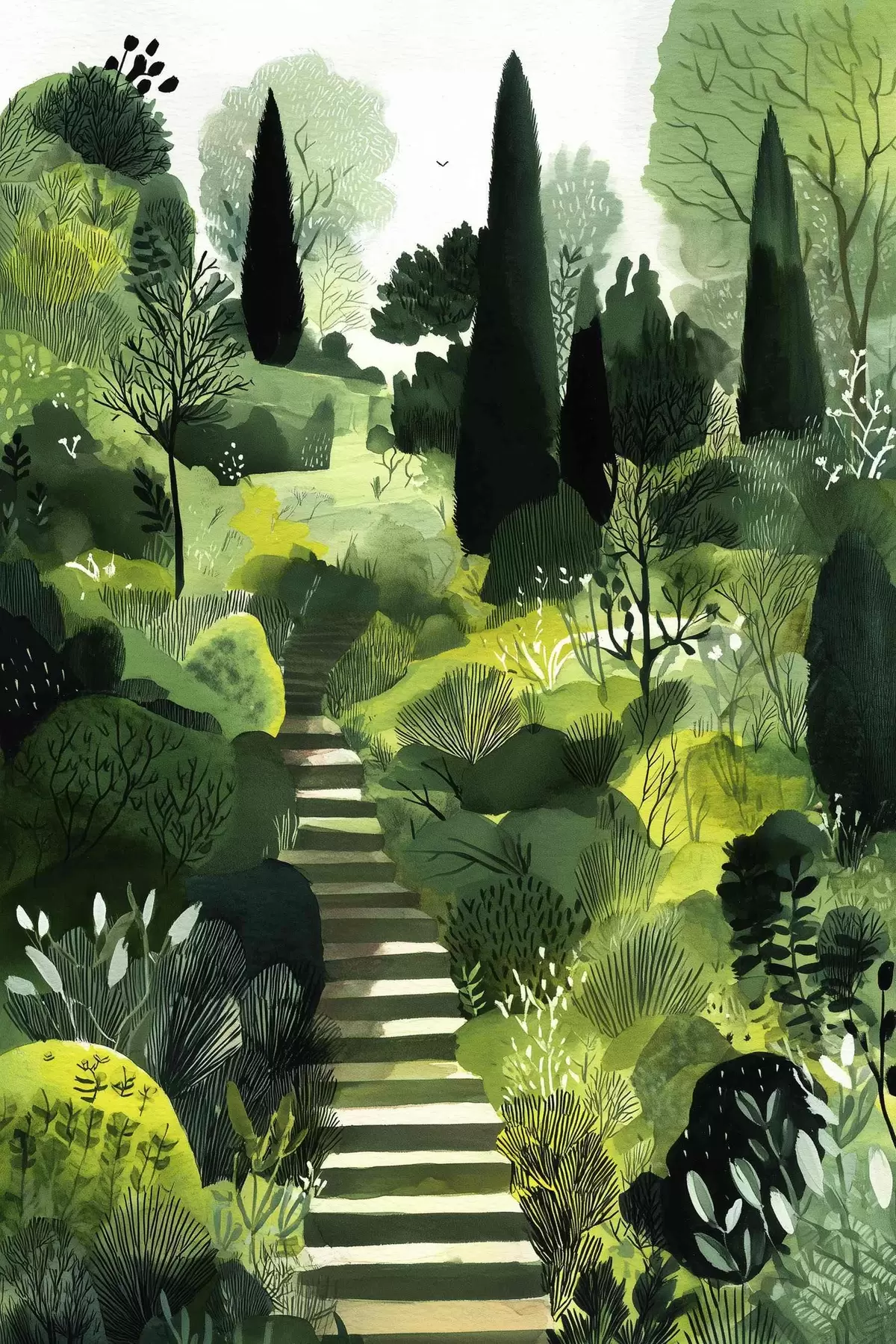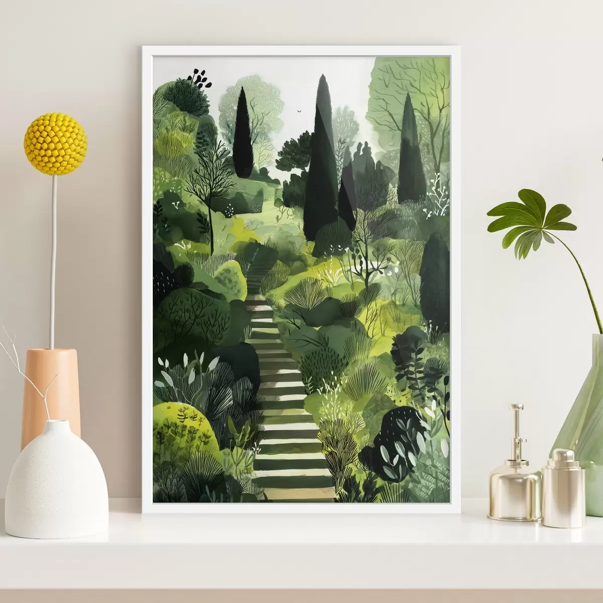 Plakat Rohelised künkad puude ja põõsastega, betoonist trepid, lopsakad värvid f44980