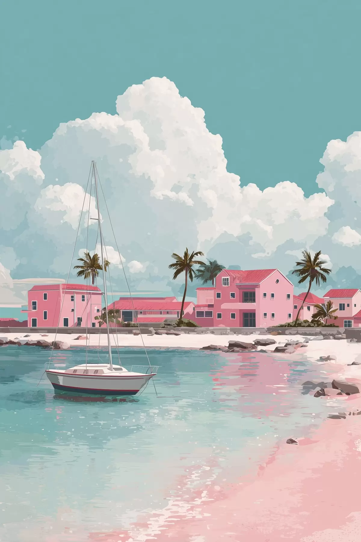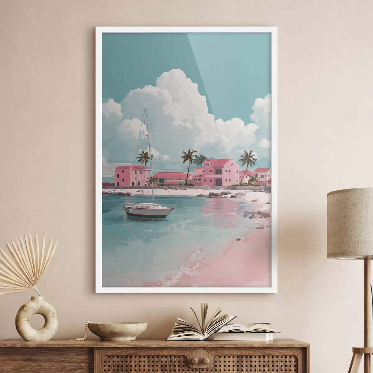 Plakat Roosa rand heleda päikesepaistega, purjekas ja majad f44986