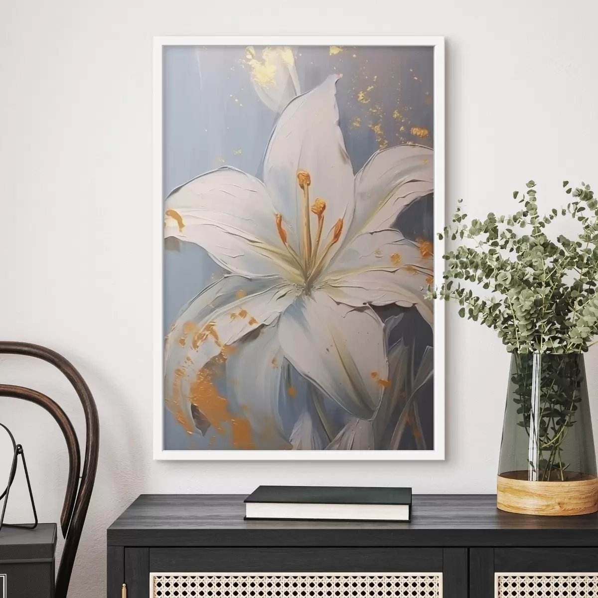Plakat Valge liilia kollaste aktsentidega sinisel taustal f45078