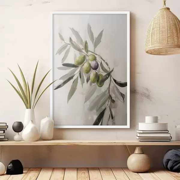 Poster rohelised oliivid, okste detail, kerge taust, orgaaniline, naturaalne palett, maalähedane, maalähedane Nr f45110