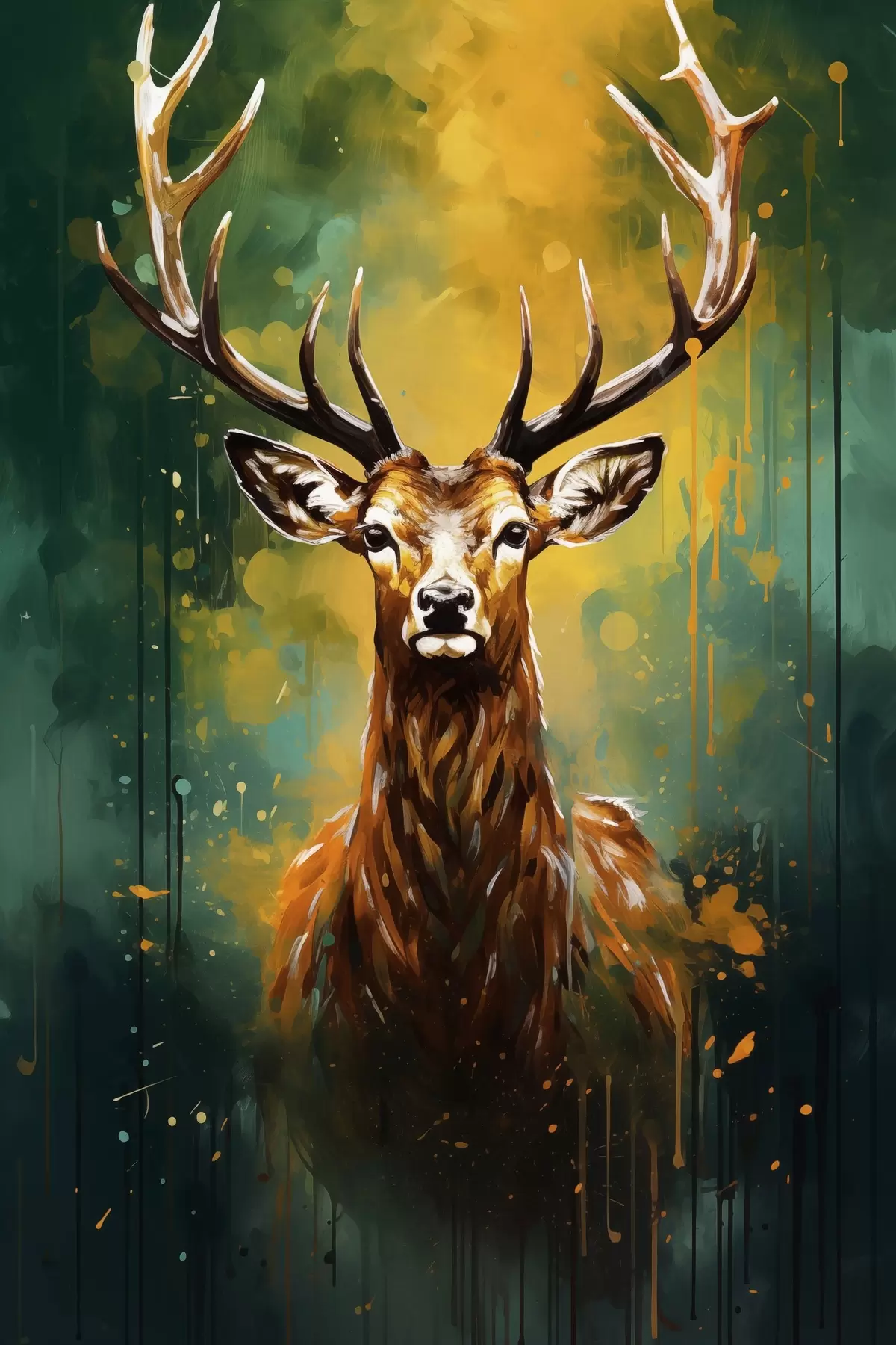 Plakat hirv, sarved, metsaroheline, oranž pritsmed, loomaportree, värvitilgad, julge, metsloomad, metsloomad f45111