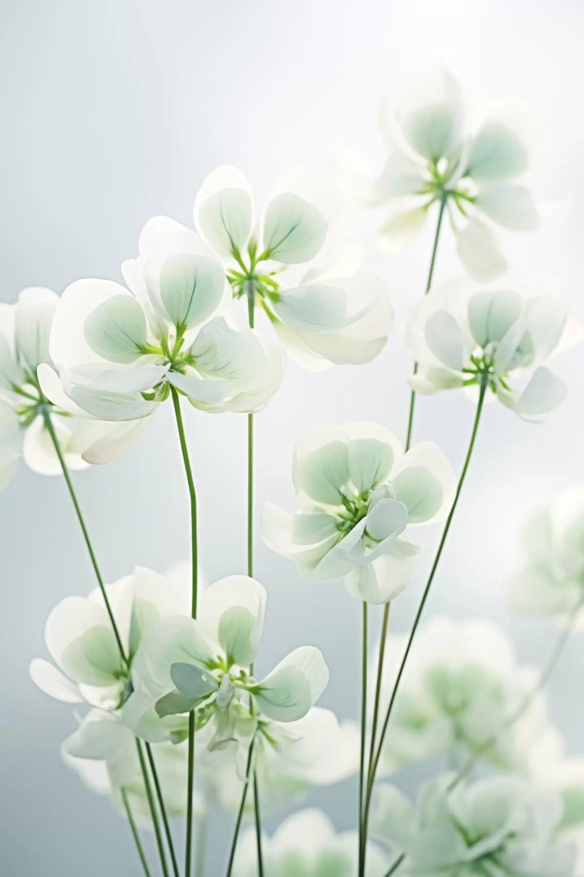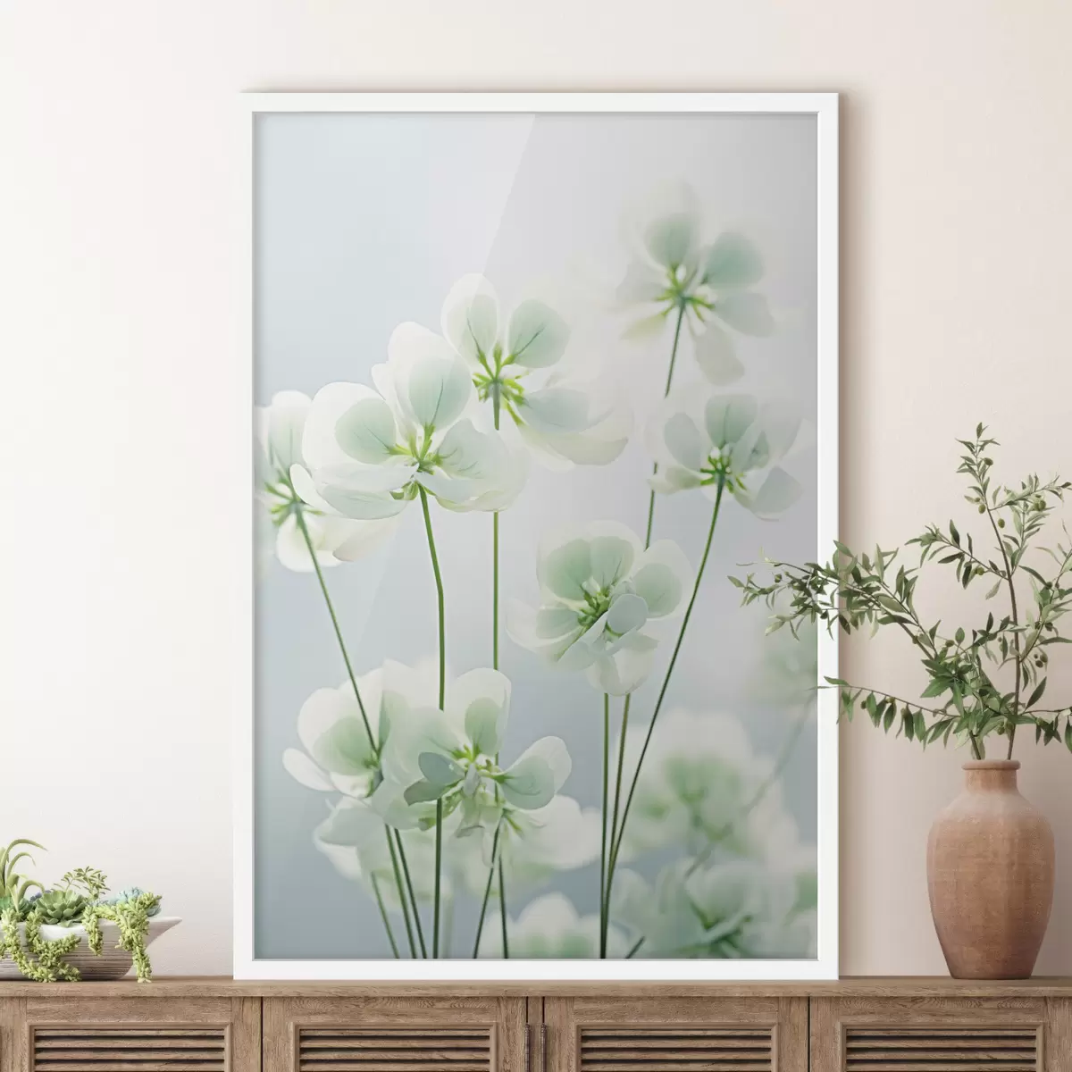 Plakat Valge ristiku lilled rohelise varre ja lehtedega, pehme valgustus, puhas taust, minimalistlik kompositsioon, botaanika f45172