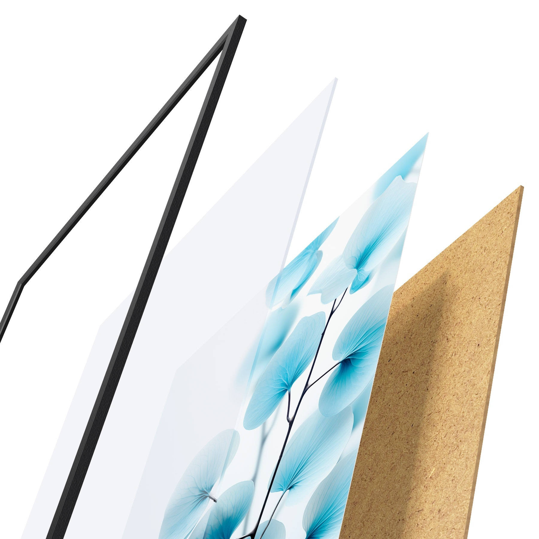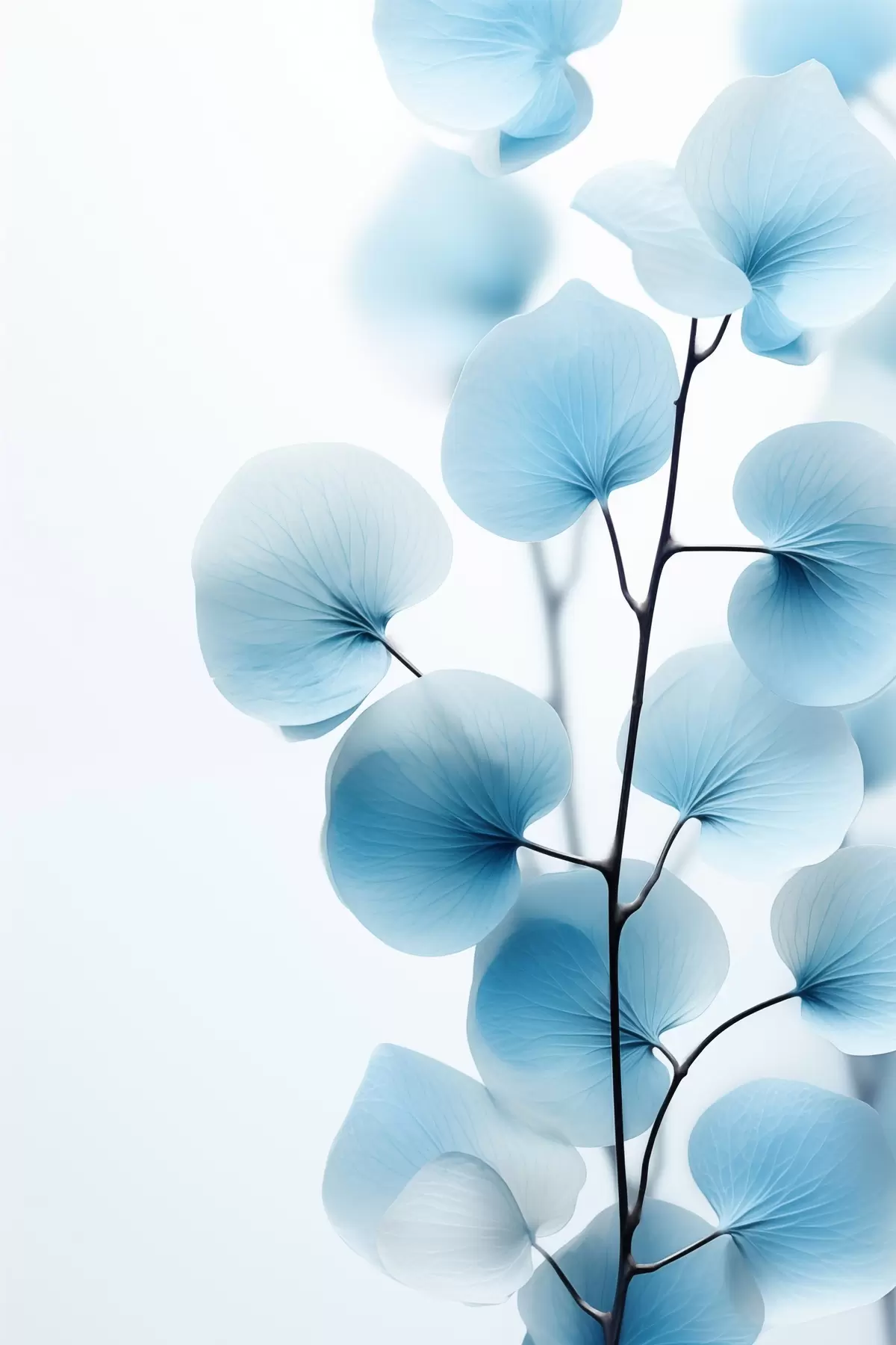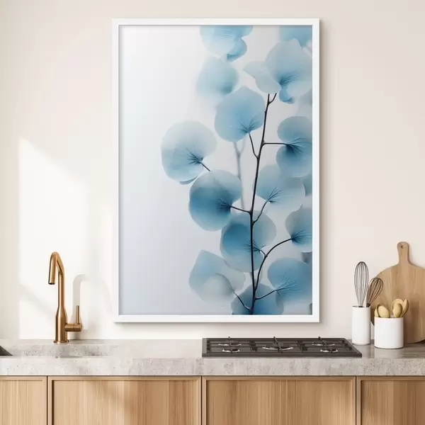 Poster Läbipaistvate siniste lehtedega oks, õrnad veenid nähtavad, kerge ja rahulik kompositsioon, minimalistlik esteetika Nr f45176