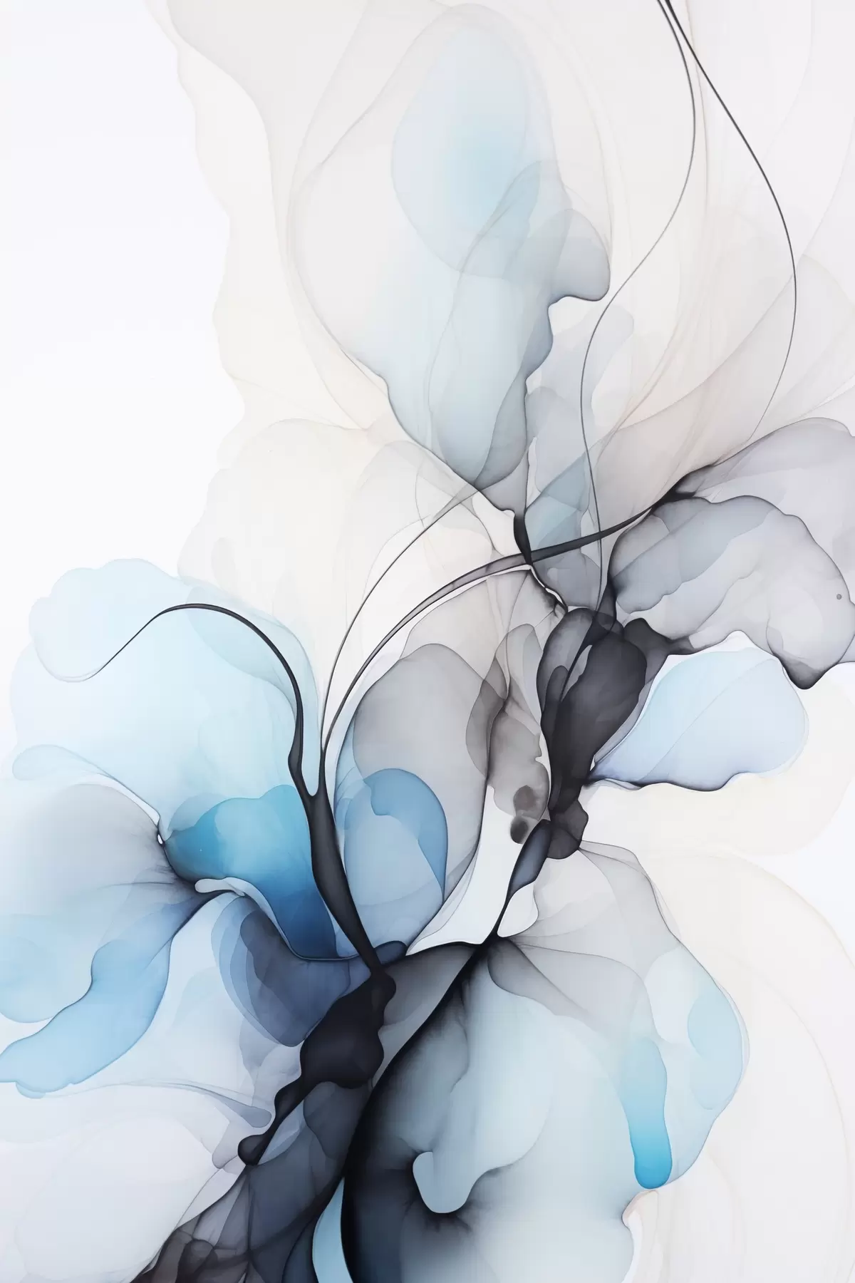 Poster Abstraktne kompositsioon voolavate joonte ja läbikumavate kroonlehtedega sinise valge ja beeži toonides, alkoholi tindi imitatsioon Nr f45177