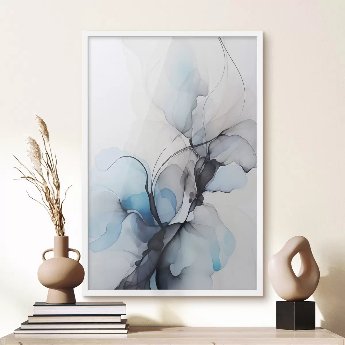 Plakat Abstraktne kompositsioon voolavate joonte ja läbikumavate kroonlehtedega sinise valge ja beeži toonides, alkoholi tindi imitatsioon f45177