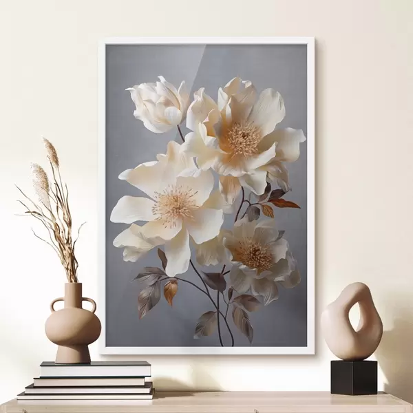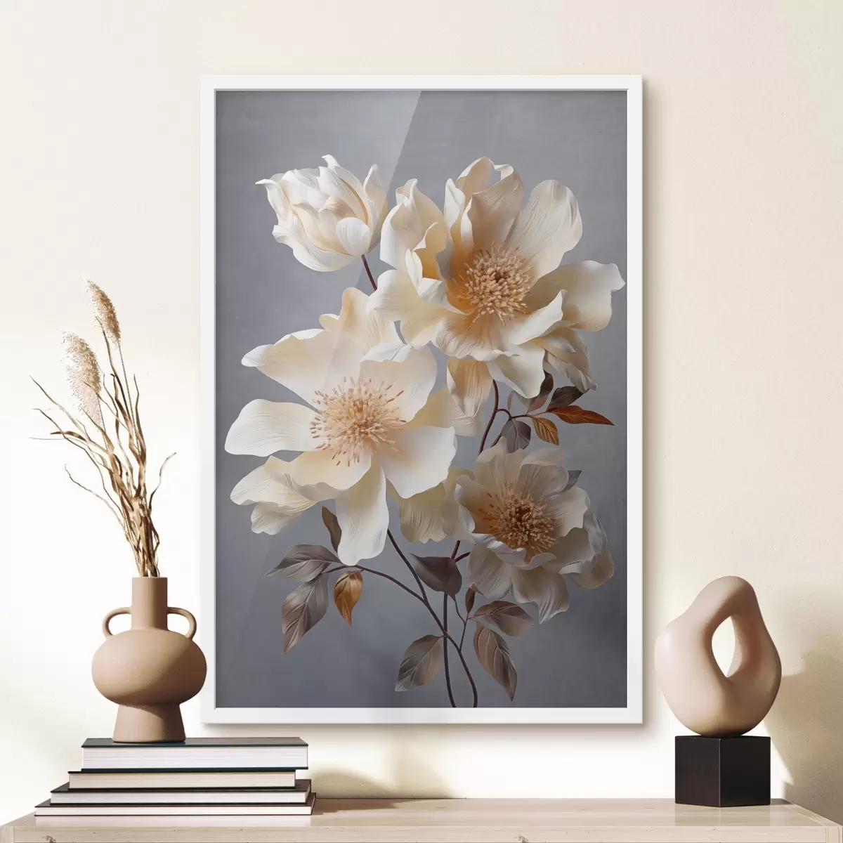 Poster Tekstuursed lilled oranžide õite ja oranžide lehtedega halli taustal, pehme valgus, elegantne, detailne, realistlik Nr f45181