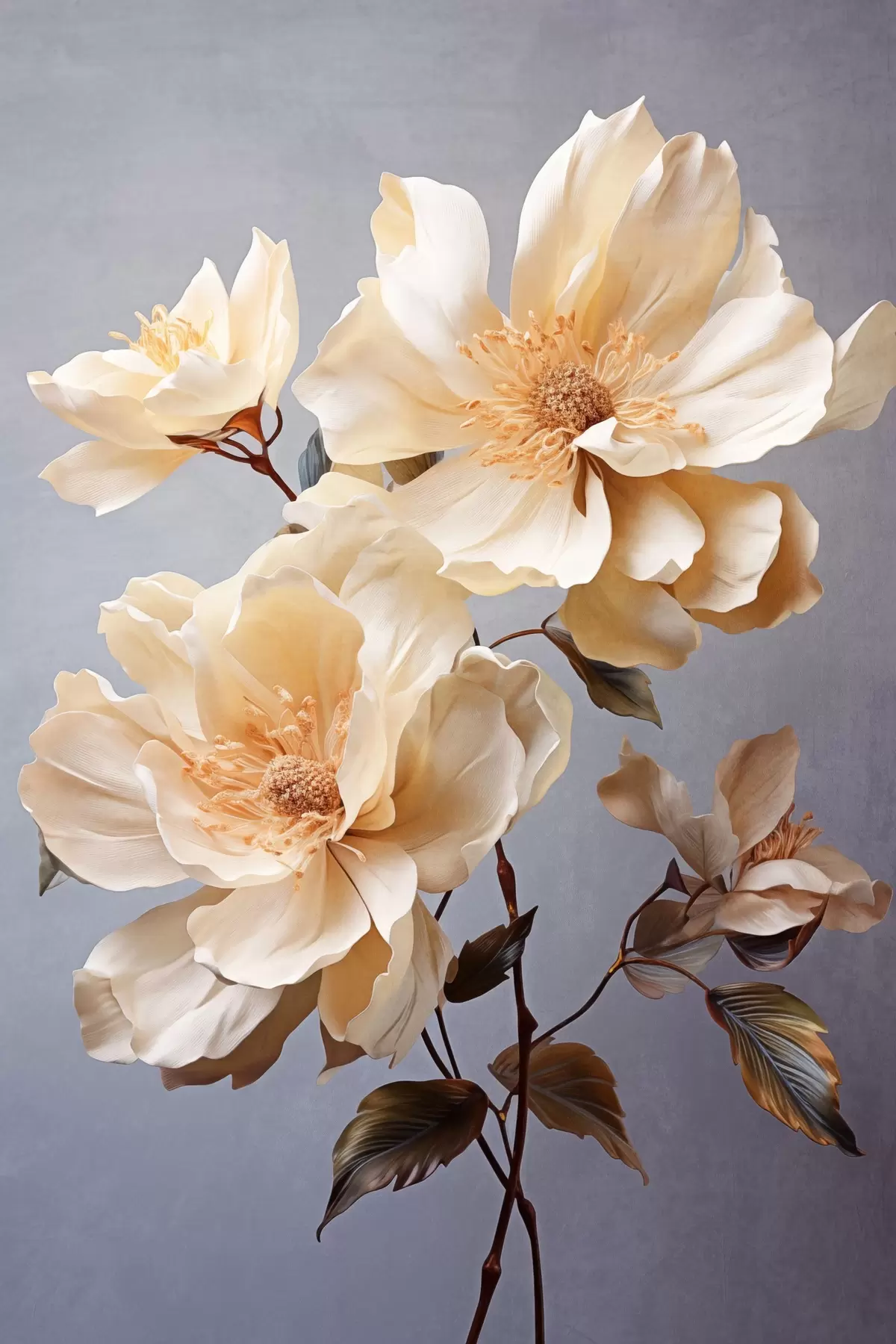Plakat Tekstuursed lilled oranžide õite ja oranžide lehtedega halli taustal, pehme valgus, elegantne, detailne, realistlik f45182