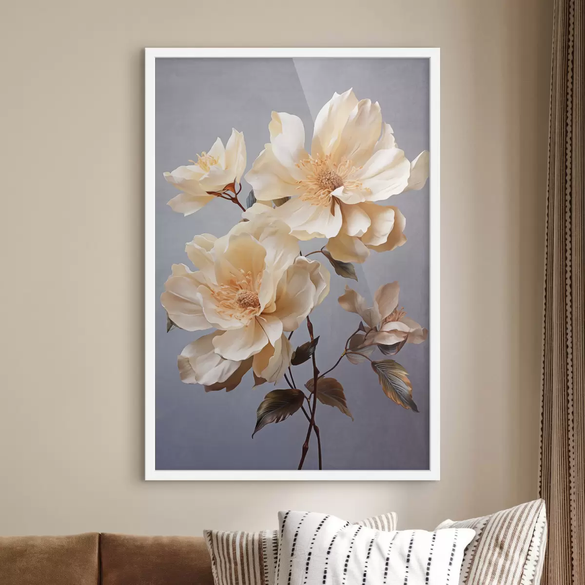 Poster Tekstuursed lilled oranžide õite ja oranžide lehtedega halli taustal, pehme valgus, elegantne, detailne, realistlik Nr f45182