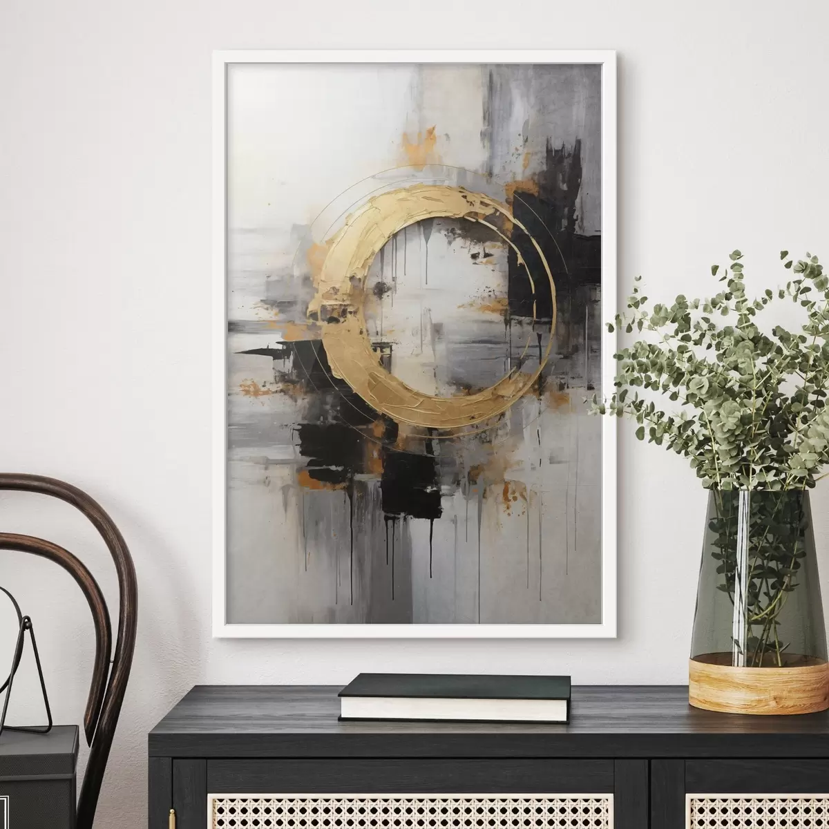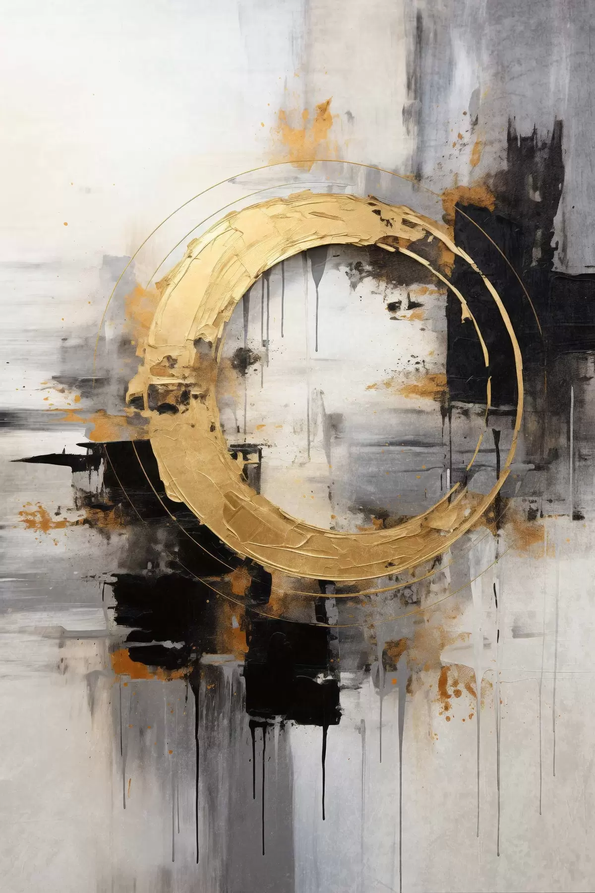Plakat Abstraktne maal ringide, mustade ja kollaste joontega ning halli ja valge tooniga taustaga f45186