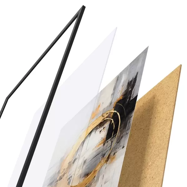 Poster Abstraktne maal ringide, mustade ja kollaste joontega ning halli ja valge tooniga taustaga Nr f45186