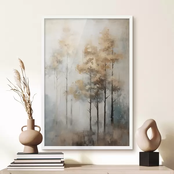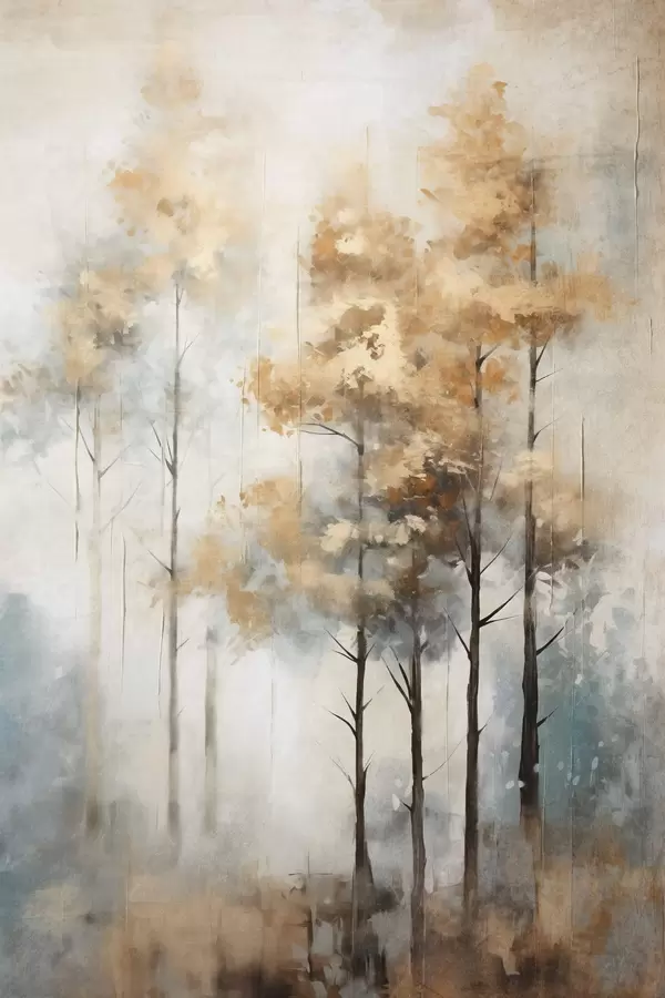 Poster Tekstureeritud kõrged puud kollaste lehtedega metsas , taustal on pehme sinise ja pruuni tooni segu Nr f45187