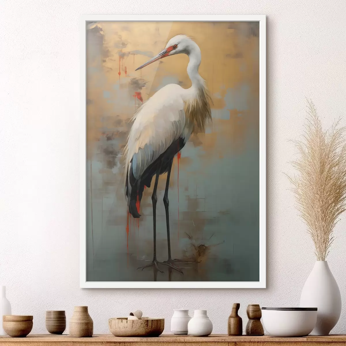 Poster Valge haigur vaiksete kollaste, pruunide ja siniste toonide taustal, mis viitavad udusele, abstraktsele maastikule Nr f45191