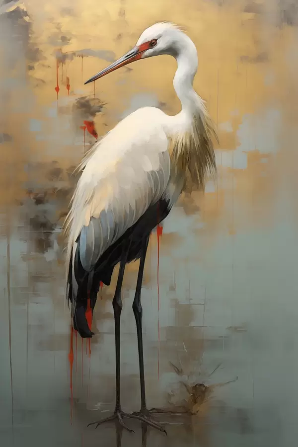 Poster Valge haigur vaiksete kollaste, pruunide ja siniste toonide taustal, mis viitavad udusele, abstraktsele maastikule Nr f45191