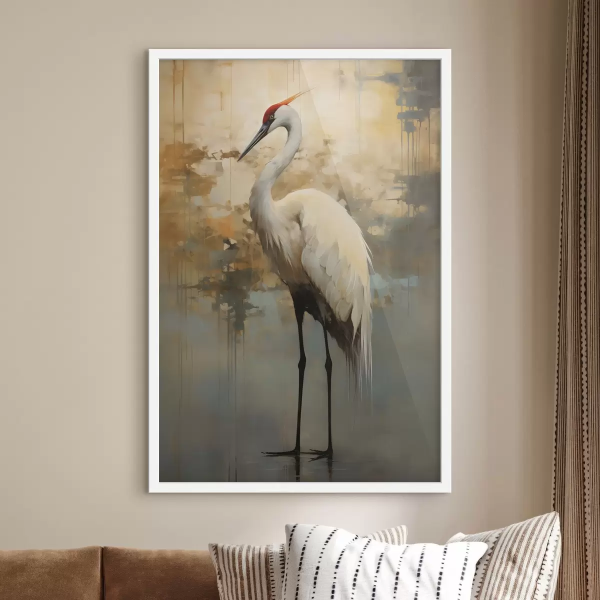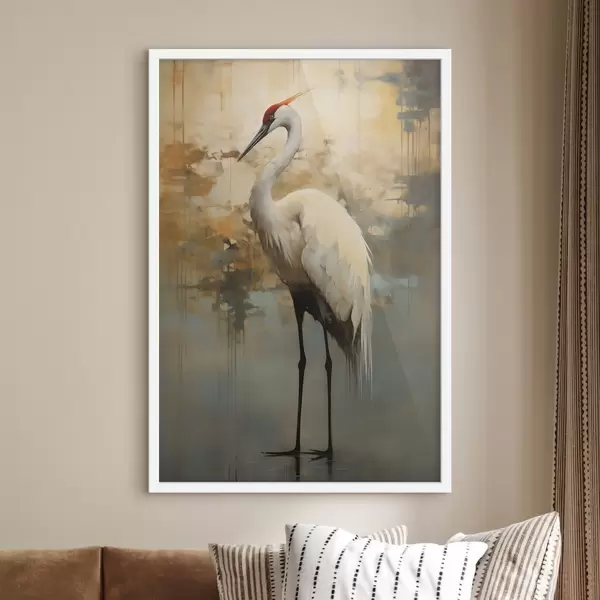 Poster Valge haigur vaiksete kollaste, pruunide ja siniste toonide taustal, mis viitavad udusele, abstraktsele maastikule Nr f45192