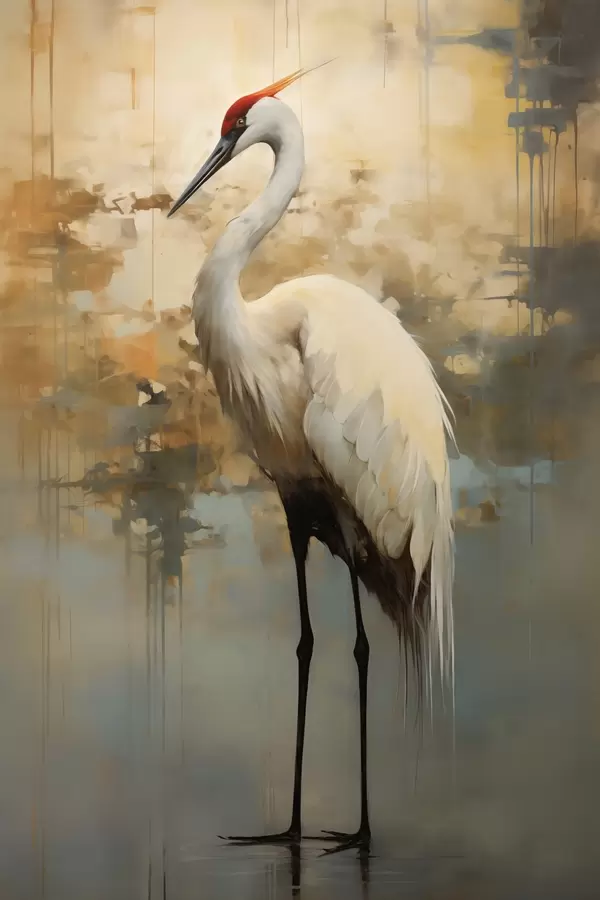 Poster Valge haigur vaiksete kollaste, pruunide ja siniste toonide taustal, mis viitavad udusele, abstraktsele maastikule Nr f45192