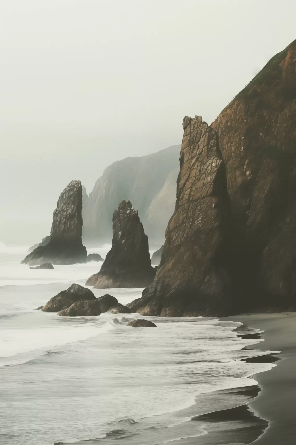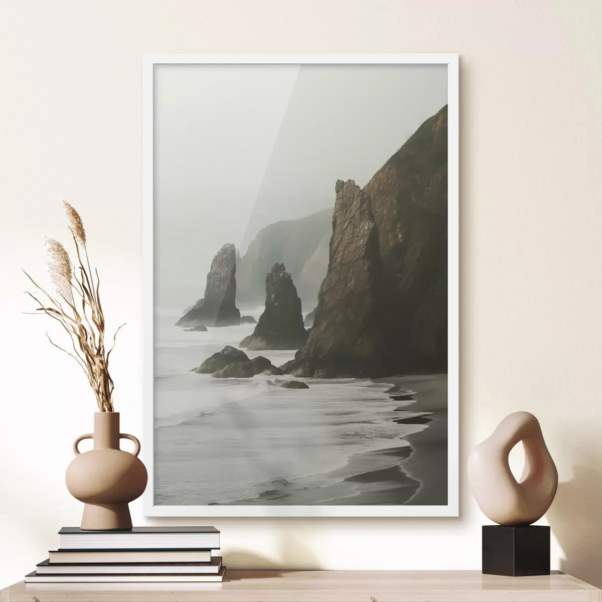 Poster Kaljused kaljud ja mererannik, lained loksuvad kaldal, meeleoluka atmosfääriga maastik, maapealsed toonid Nr f45193
