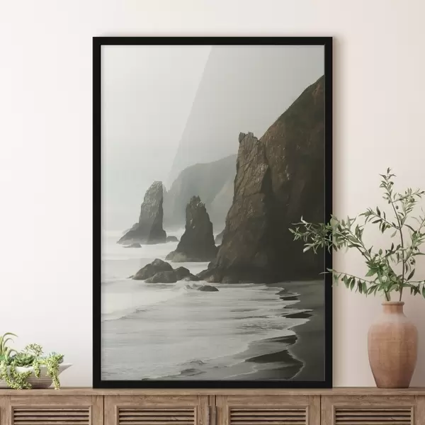 Plakat Kaljused kaljud ja mererannik, lained loksuvad kaldal, meeleoluka atmosfääriga maastik, maapealsed toonid f45193