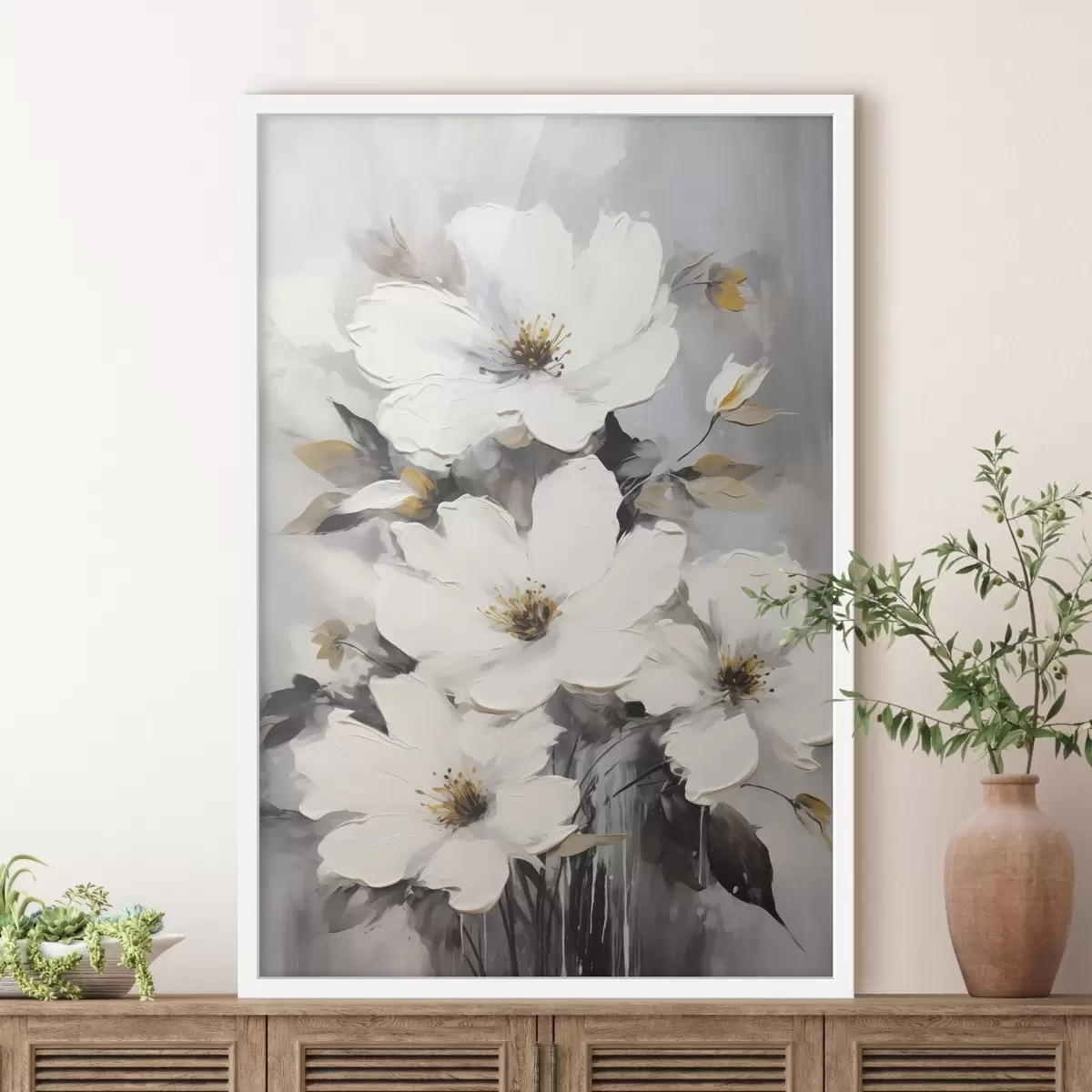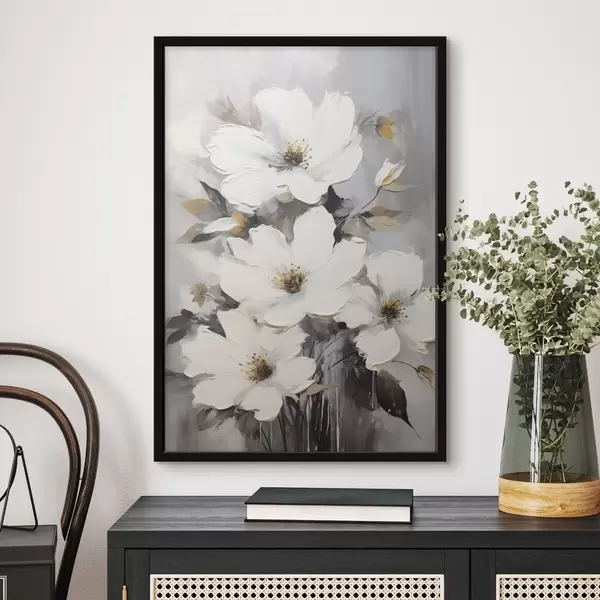 Plakat Valged lilled: mahuline maalimine hallile taustale f45252