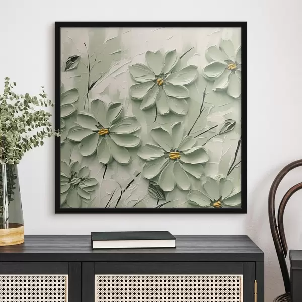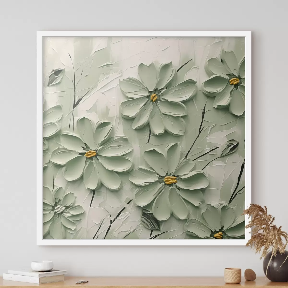 Poster Rohelised lilled kollase keskusega värvitud paksude pintslitõmmetega heledal taustal Nr f45265