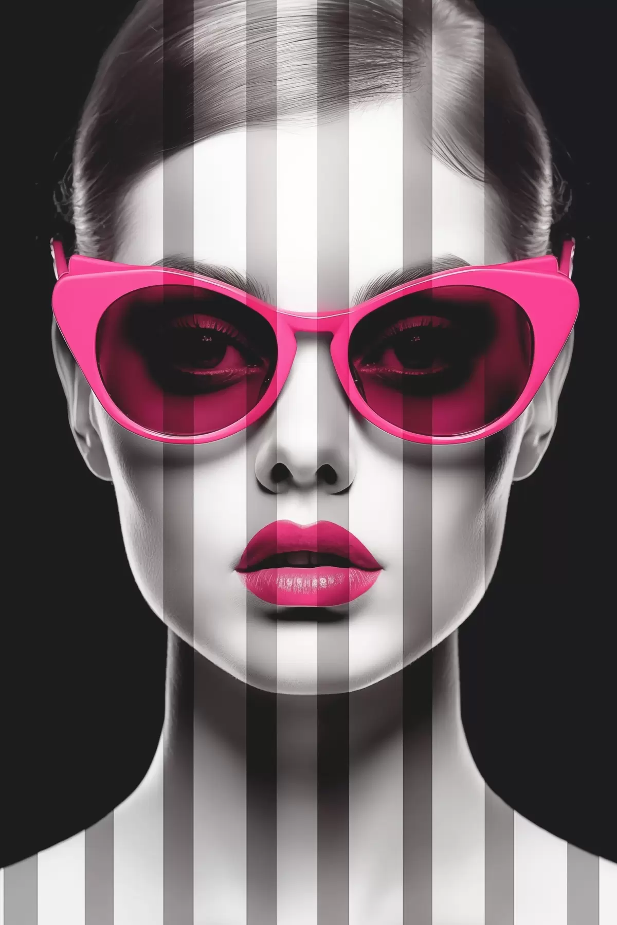 Plakat Naine kannab roosa prille, millel on mustad ja valged triibud f45315