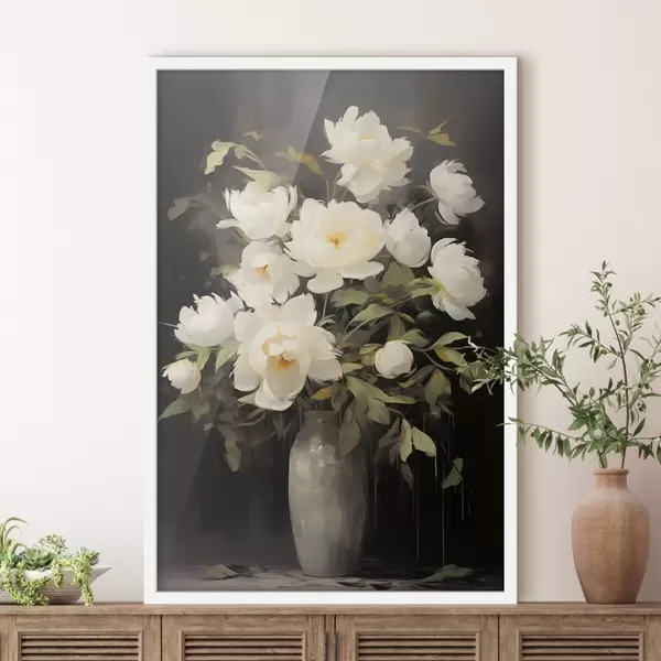 Poster Õrnad pioonid vaasis: lillekompositsioon maali stiilis Nr f45532